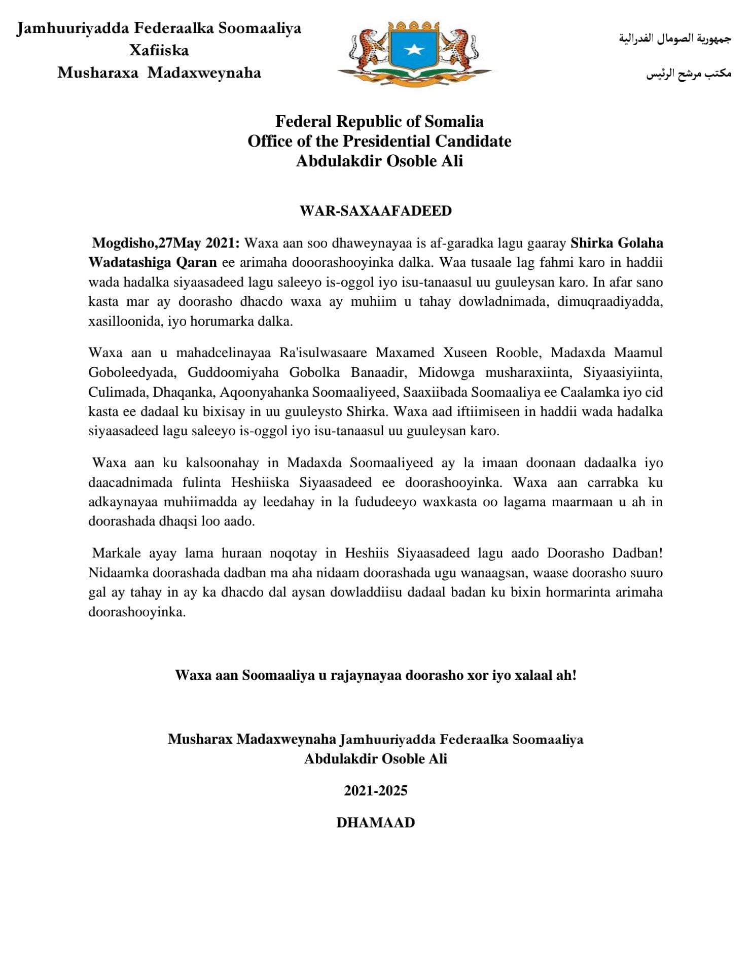 Musharax Madaxweyne Abdulkadir Osoble Ali ayaa soo dhaweynayaa is af-garadka lagu gaaray Shirka Golaha Wadatashiga Qaran ee arimaha dooorashooyinka dalka....